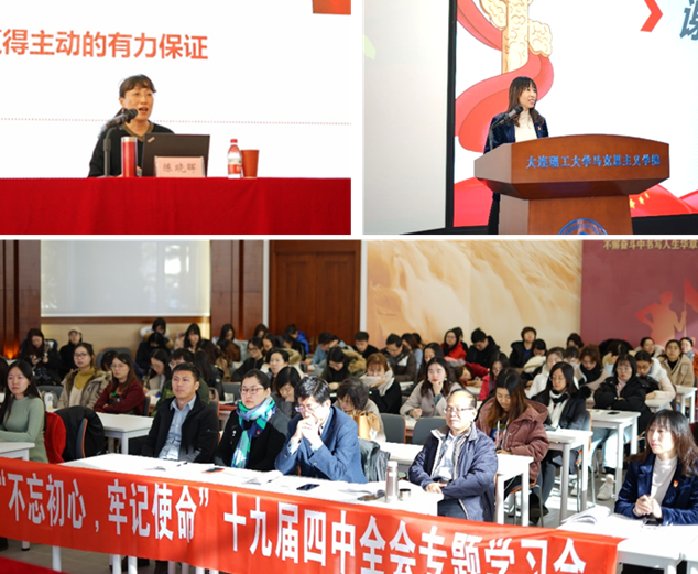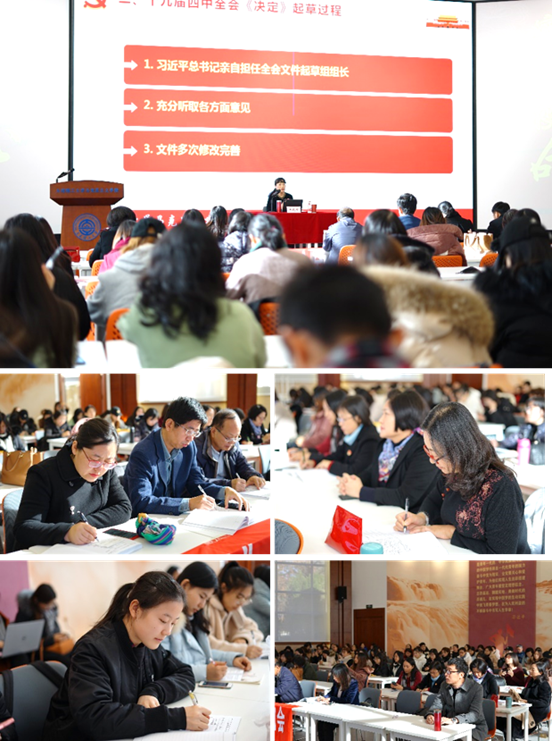 陈晓辉教授从十九届四中全会的重大意义、十九届四中全会《决定》的起草过程、主要内容、主要亮点、坚持中国特色社会主义政治制度自信等方面,对十九届四中全会精神进行了详细阐释。她指出,十九届四中全会《决定》首次系统概括了中国特色社会主义制度和国家治理体系的“十三大显著优势”,提出了国家治理体系和治理能力现代化分“三步走”的总目标,对推进国家治理体系和治理能力现代化作出了一个根本性的重大判断。