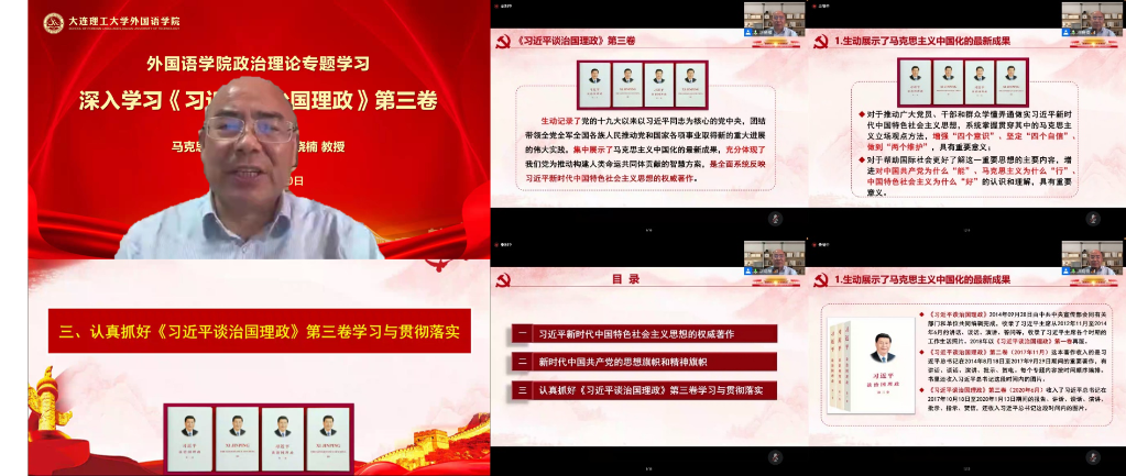 为扎实推进党史学习教育,提高教师的思政工作能力,11月10日下午,外国语学院开展教师思政专题学习暨党史学习教育论坛第五期。马克思主义学院院长洪晓楠教授受邀作主题为“深入学习《习近平谈治国理政》第三卷”的专题报告。学院党委书记张丽主持论坛,外国语学院主校区、盘锦校区师生近300人参加线上报告会。