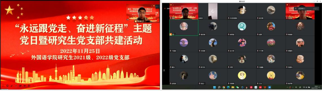 2022年11月25日,外国语学院研究生2021、2022级党支部线上召开了“永远跟党走、奋进新征程”主题党日暨研究生党支部共建活动。学院党委组织员潘迪、外国语学院研究生2021、2022级党支部全体党员与入党积极分子参加。活动由22级党员胡磊主持。