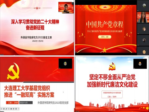 党日活动以2022级党支部主题汇报学习为起始,胡磊同志以“深入学习贯彻党的二十大精神、奋进新征程”为主题进行了汇报,带领外国语学院研究生2022级党支部从十五个方面全面学习了党的二十大报告的主要内容,并深刻领会党的二十大的主题。汪莹同志接着以“学习和了解中国共产党历次党章的制定及修订情况”为主题,学习了解《中国共产党章程》历次修订内容对做一名新时代合格党员的重要意义。王利华同志从“方案总体思路和预期目标”“方案基本原则”“重点任务”,以及“工作原则”四个方面对《大连理工大学基层党组织推进“一融双高”实施方案》进行了全面介绍。最后范宏伟同志以“坚定不移全面从严治党,加强新时代文化廉洁建设”为题,汇报讲解了新时代文化廉洁建设的四个重点,为支部党风廉政建设提供了方法与指引。