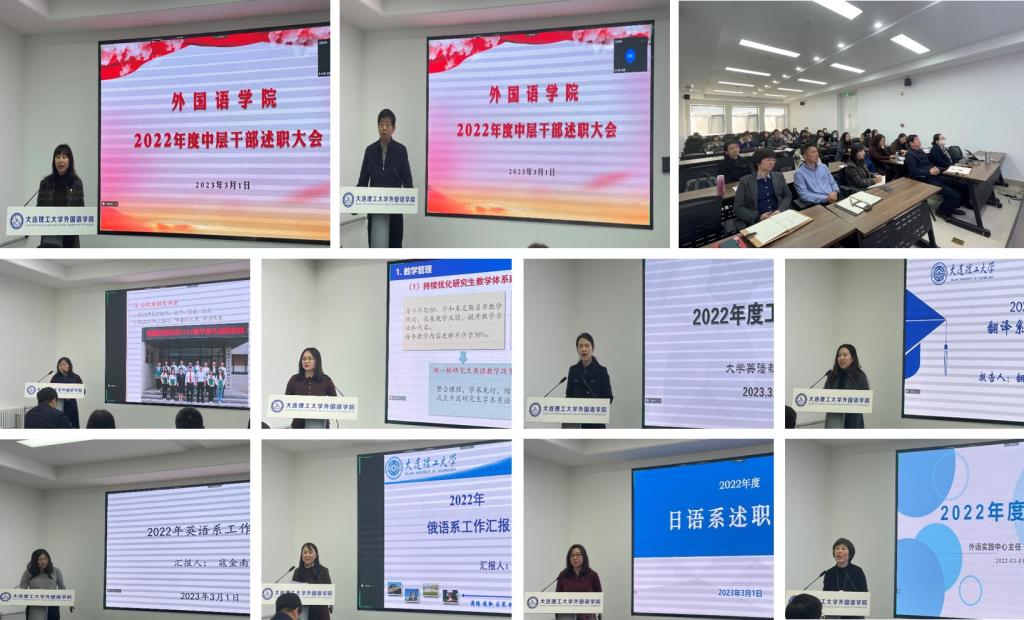 为深入学习宣传贯彻党的二十大精神,进一步推动“一融双高”建设,增强学院中层干部和党支部书记履职能力,2023年3月1日下午,外国语学院于海晏楼715会议室召开了2022年度中层领导干部述职和党支部书记述职汇报大会。外国语学院党政领导班子、各系部主任、副主任、秘书、党支部书记、副书记和师生代表参加了会议。会议由学院党委书记张丽主持。