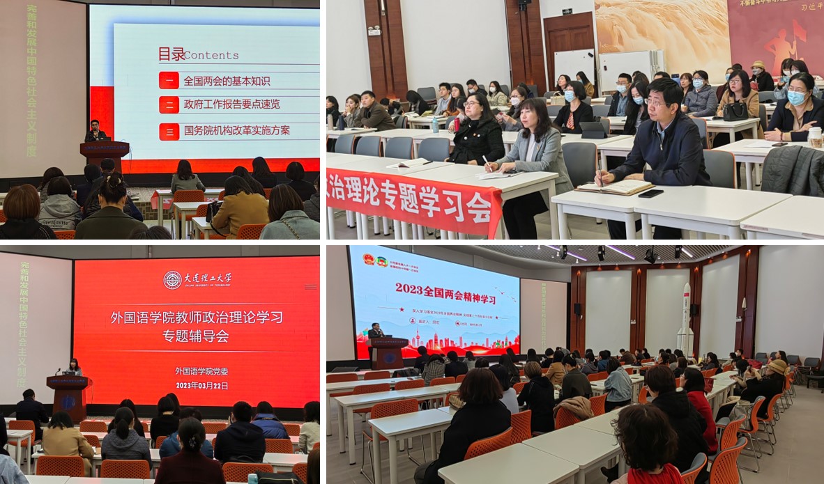 为推进习近平新时代中国特色社会主义思想“三进”工作,以“一融双高”建设推动学院事业发展,3月22日下午,外国语学院党委在马克思主义学院情景教室举行2023年教师政治理论专题学习会(党委扩大学习会)第一期,邀请马克思主义学院副院长屈宏围绕2023年两会精神作专题报告。党委书记张丽主持会议,学院主校区、盘锦分院和开发区教学中心的全体教师和学生代表以线上和线下方式共同参加。