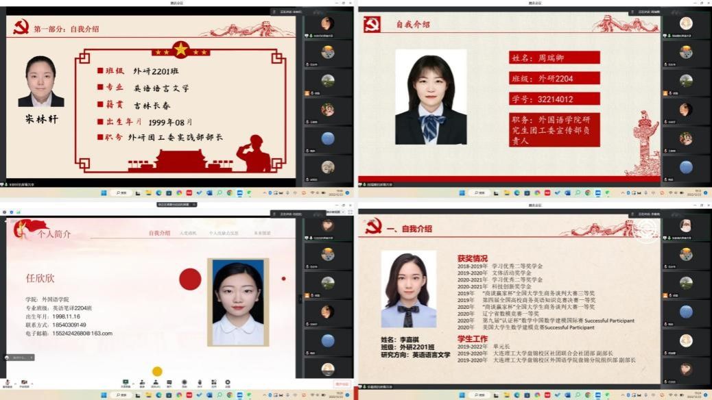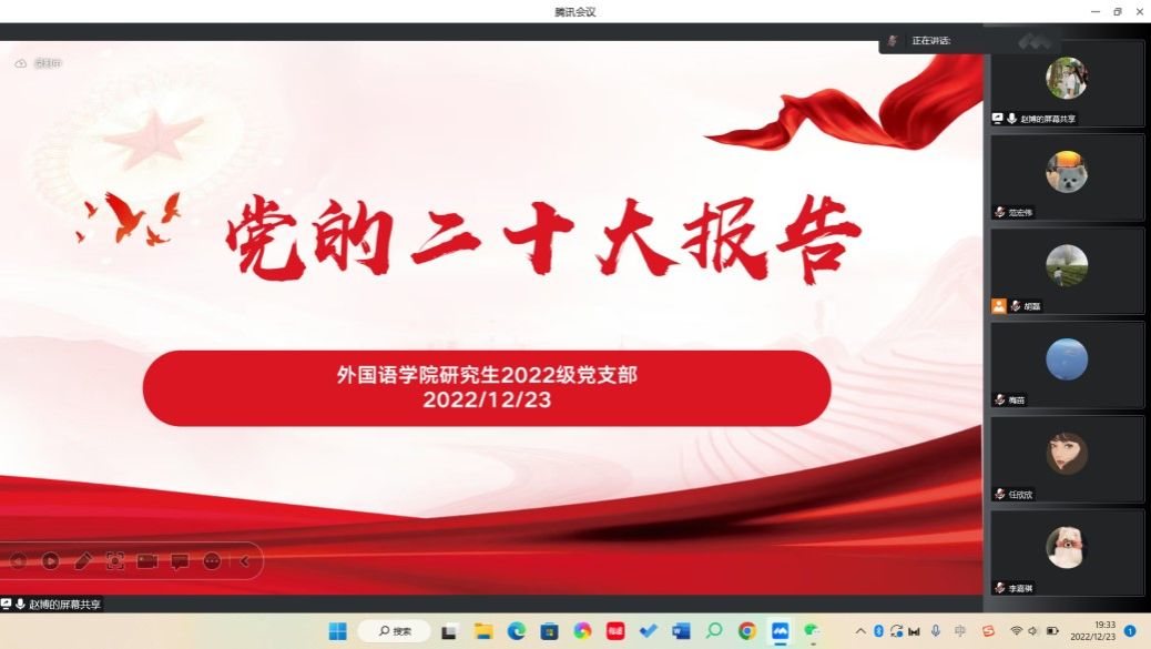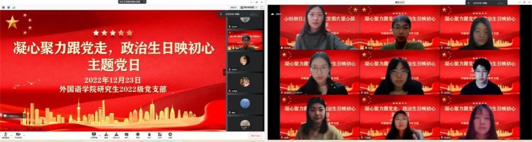 2022年12月23日,外国语学院研究生2022级党支部在线上召开了“凝心聚力跟党走,政治生日映初心”主题党日活动。外国语学院研究生2022级党支部全体党员、入党积极分子以及入党申请人参加。本次活动由22级党员胡磊同志主持。