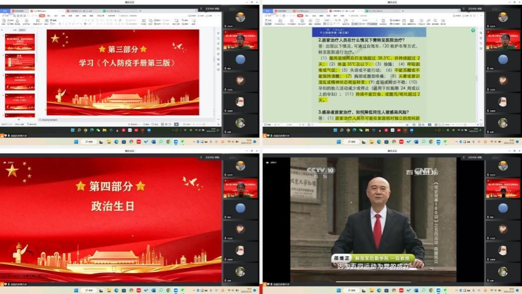 党日活动的最后一项是为于本季度入党的14名同志庆祝政治生日。支部带领大家学习观看了党史故事一百讲的微课视频,“党史故事100讲”系列微视频以党的发展历程为顺序,以党的重大事件为线索,以不同时期的典型事例、历史人物、精彩故事为主干,全景式回顾党的伟大历程和辉煌成就。观看视频使大家深化对党的认识,珍惜政治生命,激发奋斗、奉献的内在自觉,激励自己不忘初心、牢记使命。在观看完视频之后,则由范宏伟、于丽娟、高瑞敏、郭舒涛四位同志作为代表分别分享有关政治生日的感悟。此外,支部还为过政治生日的党员精心准备了生日贺卡图片,在会后分别发送给了14位党员同志。最后,在胡磊同志带领下,全体党员庄严肃穆地重温入党誓词。