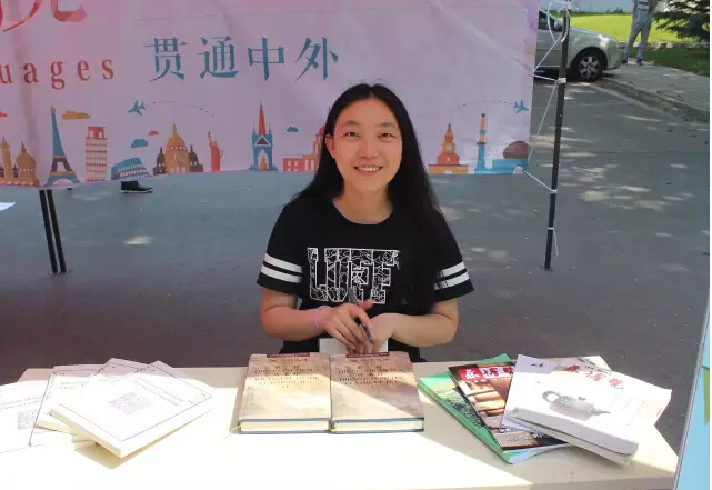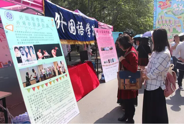 在外国语学院的展位后坐着三名面带微笑的同学招待参观的游人。他们都是外国语学院学生会及团委的成员们。顶着似火骄阳的考验,忍着热闹喧嚣的诱惑,他们始终耐心友善地回答游客的问题。其认真负责且亲切幽默的工作作风,无疑是对外国语学院精神的最好诠释。