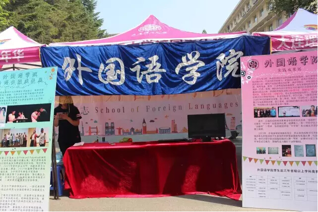 今年外国语学院的展台位于主楼东侧,以展示外国语学院近五年科研成果为主线索,学院用外语实践成果况及茶文化等方面展现出外国语学院取得的种种骄人成绩,向外界展示出外国语学院积极进取,活力四射,专业扎实的学院风貌,更展现了外语人勇于向上,敢于攀登的精神文明。各路游人也通过游览、咨询加深了对外国语学院的认识与了解,并表达出对我院成绩的肯定与期望。