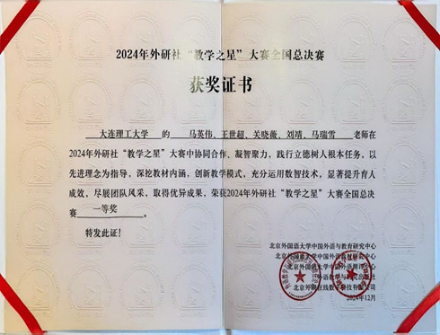 12月6日,备受瞩目的2024年外研社“教学之星”大赛全国总决赛在北京圆满收官。在激烈角逐中,19组优秀的教师团队展现了他们的教学风采和专业技能。本次大赛吸引了超过8万名教师线上观摩交流,共同探讨数智赋能外语教学的有效路径。经过激烈的竞技,我校外国语学院教师团队马英伟、王世超、关晓薇、刘靖、马瑞雪五位老师脱颖而出,荣获全国总决赛一等奖。