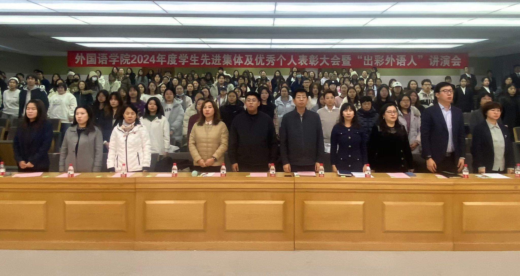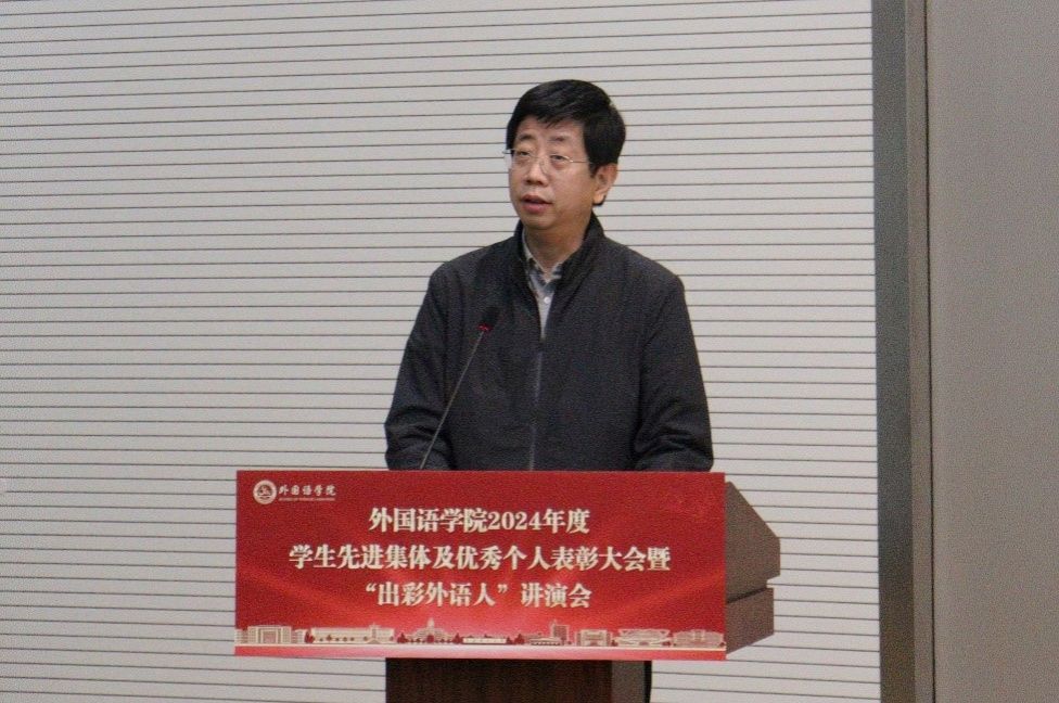 12 月 17 日晚,外国语学院2024年度学生先进集体及优秀个人表彰大会暨“出彩外语人”讲演会在学生活动中心成功举行。外国语学院全体党政领导班子成员、各系主任、教师代表、全体辅导员、本科生、研究生以及厚德书院副院长范辞涵、辅导员宋钰熙、大一同学到场参会。大会由学院党委副书记兼副院长秦志强主持。