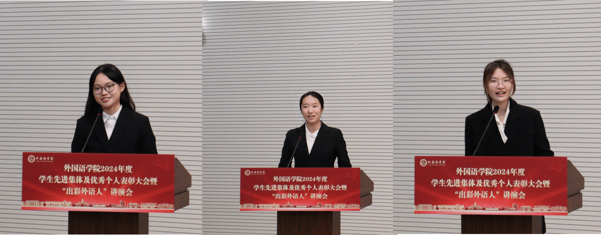 讲演环节共分为“自强·做矢志奋斗的外语人”、“笃学·做踏实奋进的外语人”、“同行·做并肩前行的外语人”、“卓越·做堪当大任的外语人”四个篇章,学校自立自强标兵提名奖获得者马顺怡、上银菁英奖学金获得者李济涛、挑战杯国家级二等奖获得者高妍萱、外英 2202 班代表、9 舍 331 寝室代表、国家奖学金代表张馨予、杜程程、“出彩外语人”实习实践类代表杨宝婵等8组同学分别讲述了她们的奋斗故事。每个人都从迷茫、失落中走来,在曲折探索中不断磨练自身本领、发现自身的发展之路,最终收获属于自己的果实。在场的学生悉心听讲,备受鼓舞。