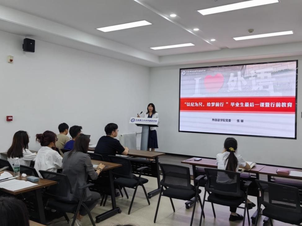为引导毕业生党员坚定理想信念、强化纪律意识、勇担时代使命,外国语学院党委于6月5日在海晏楼715举办了2025届毕业生党员“最后一课”暨行前教育活动。学院党委书记张丽为全体毕业生党员讲授主题党课,本科、硕士全体毕业生党员参加。