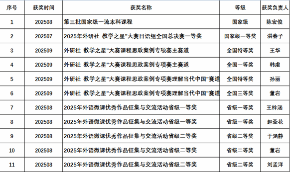 外国语学院长期坚持“以赛促教、以教强课”的发展路径,通过构建“培训—磨课—竞赛—孵化”全链条教师成长体系,将竞赛成果有效转化为教学资源与课程建设优势。“以赛促教”成效显著:仅2025年,学院教师团队就已荣获国家级教学奖项6项、省级5项。