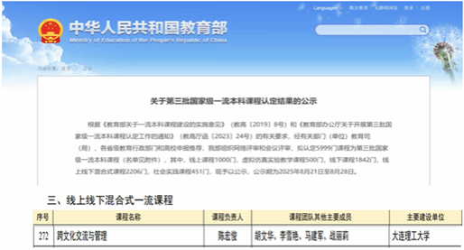 近日,教育部公布第三批国家级一流本科课程认定结果,外国语学院陈宏俊教授主讲的《跨文化交流与管理》课程成功入选。这是学院践行“以赛促教、以教强课”理念的标志性成果。至此,学院国家级“金课”增至3门,课程建设再结硕果,有效助力学校“双一流”建设。