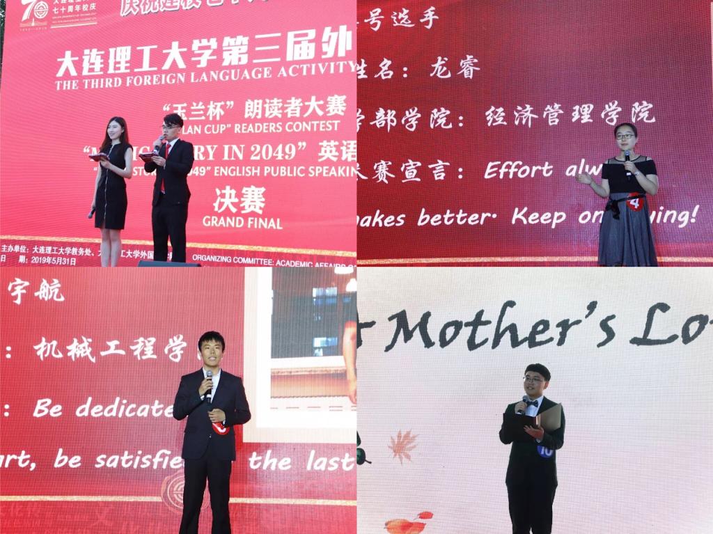 为献礼新中国成立70周年,喜迎大工建校70周年,助力学校“双一流”建设,服务学校国际化发展,营造校园外语学习氛围,5月31日晚,由教务处、外国语学院联合举办的庆祝建校七十周年,弘扬家国情怀——大连理工大学第三届外语活动月系列活动之“玉兰杯”朗读者大赛暨“My Big Story in 2049”英语演讲比赛决赛在音乐喷泉广场举行。