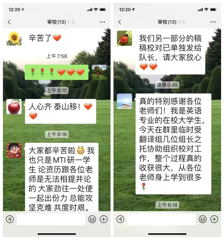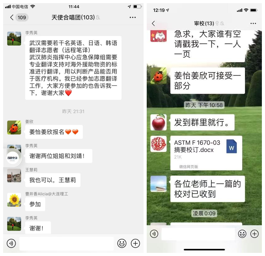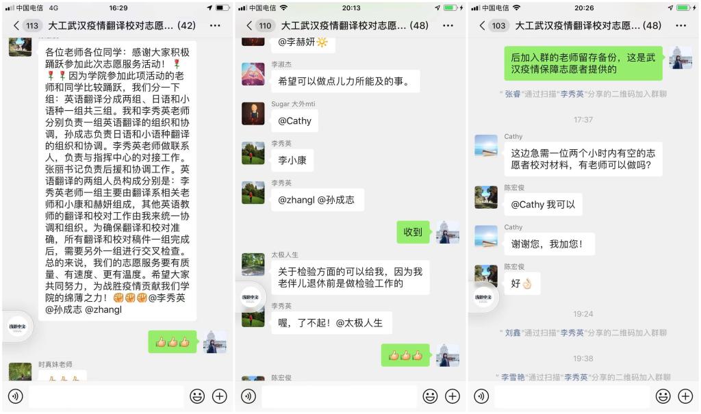 “人心齐、泰山移。”学院党委得知此事后也在第一时间作出部署,成立“大工外语武汉疫情翻译校对志愿服务组”,对广大党员和师生发出倡议,动员大家积极参与。两天之内,志愿者队伍不断扩大到50余人,人数持续增长,陆续承接后续任务。他们当中有教师、有研究生、也有本科生,大家放弃休假时间,分工合作,互相校对,齐心协力完成任务。李秀英表示:“我们只是做了自己应该做、也非常愿意做的事情。”一位群内研究生表示“我跟各位老师的资历无法相比,但大家能够劲往一处使,一起出份力,总能攻坚克难,共度时艰。”