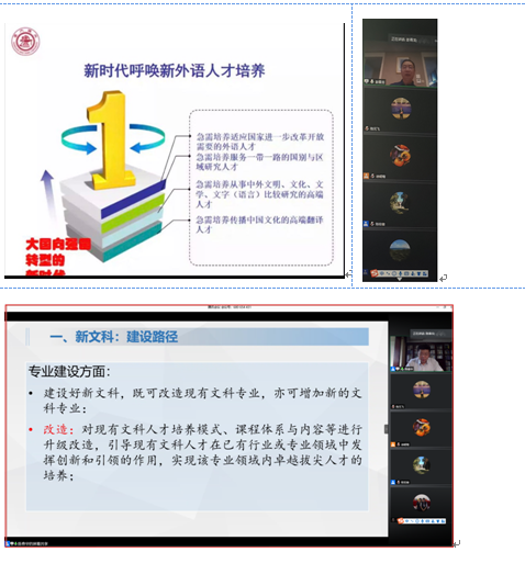 2020年5月16日上午,国务院学位委员会学科评议组专家、《上海交通大学学报(哲学社会科学版)》主编彭青龙教授和信息工程大学(洛阳校区)教学科研处长、教育部高等学校英语专业教学指导分委会委员陈春华教授分别作了题目为“新文科视野下外语人才核心素养与教育教学体系建设”和“新文科背景下的学科专业建设与人才培养”的报告。彭教授指出外语人才的“核心素养”既要注重过程,强调素养,又要注重结果,专注于素质;新文科教育要注重融合型人才培养。陈教授以传统的“洛外”为个案,分析了新文科教育理念,指出了新文科的两大特征,并提出了具体的建设路径。