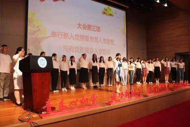 大会第三项:举行新入党预备党员入党宣誓、所有党员重温入党誓词。张丽书记在台前领誓。