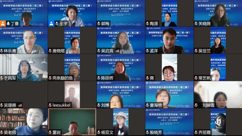 3月23日,在第一期“教师教学能力提升”培训讲座一周之后,外国语学院推出了系列讲座的第二期。此次讲座,学院邀请了辽宁省本科教学名师、开发区校区外语教育中心的王宇副教授作为主讲嘉宾,她以“成果产出导向、增值语言课学习”为讲座主题,为学院教师详细分析了一流本科课程建设的标准和要求,并结合国家级一流本科课程《IT行业职场英语》课程分享了自己的课程建设经验。70多名外国语学院教师通过腾讯会议的方式参加了此次讲座。