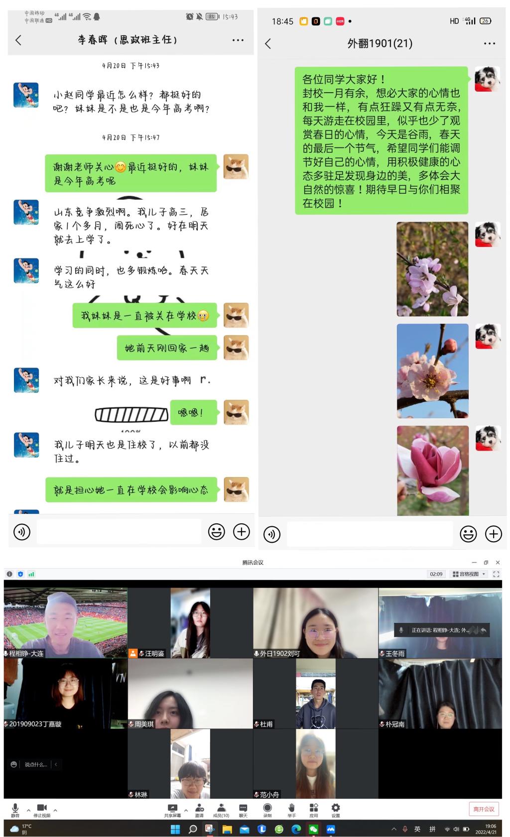 外日1901班思政班主任李春晖老师与学生逐个进行“云”谈心, 从学生的学业、家庭、日常生活等方面给与学生关心和指导;外翻1901班思政班主任赵蕊老师通过 “寻找春日的美”为话题,与班级同学“云”互动,希望同学们保持积极健康的心态,多驻足发现身边的美;外俄1901班思政班主任杨涛和外日1902班思政班主任程相铮利用体育特长,为学生带来了网球比赛和“运动与健康科普”线上讲座……