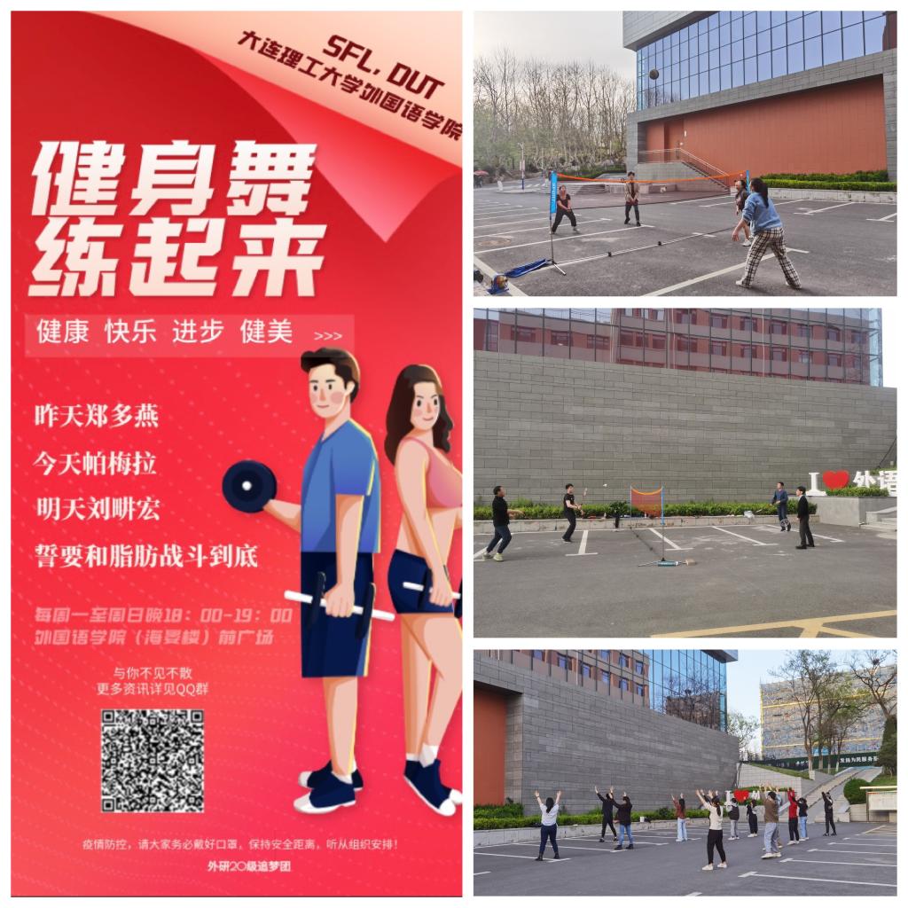 外研20级追梦团每周一至周日晚18:00-19:00相约在学院海晏楼前广场。他们通过跳舞打卡的方式,强健体魄,解压放松,守护“革命的本钱”,健身舞活动也吸引了友邻兄弟院系本研同学的踊跃参与。同学们在运动中增强身体素质、释放学习压力、享受运动乐趣。