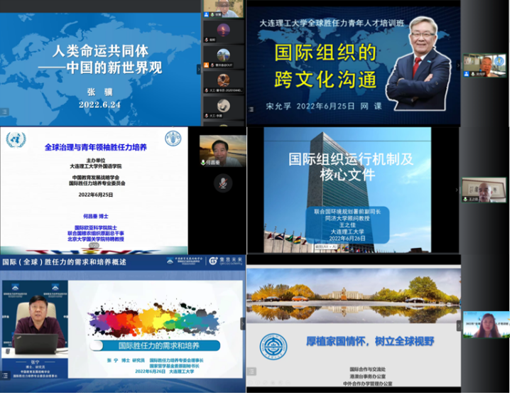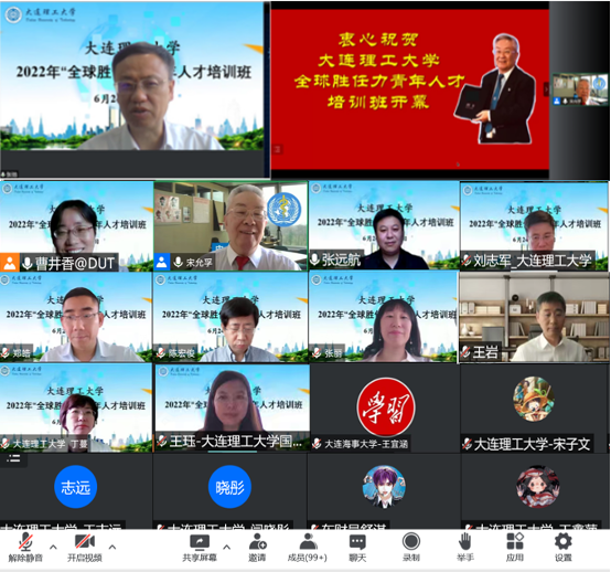 2022年6月25日上午,大连理工大学第二期“全球胜任力”青年人才培训开班仪式于线上顺利举行。大连理工大学党委常委、副校长张弛出席开班仪式并致欢迎辞,原卫生部外事司长、世界卫生组织前联合国改革与伙伴关系协调员宋允孚老师作为培训班外聘专家代表致辞并做了主题为“国际组织的跨文化沟通”的专题讲座,来自大连理工大学、东北财经大学和大连海事大学的两百余名师生在线听讲。上午的开班仪式及讲座分别由大连理工大学外国语学院院长陈宏俊和副院长丁蔓主持,外国语学院曹井香老师介绍了本次培训情况及讲座安排。大连理工大学教务处、研究生院、国际合作与交流处、招生就业处、外国语学院以及大连海事大学、东北财经大学的相关负责人出席了开班仪式和讲座。