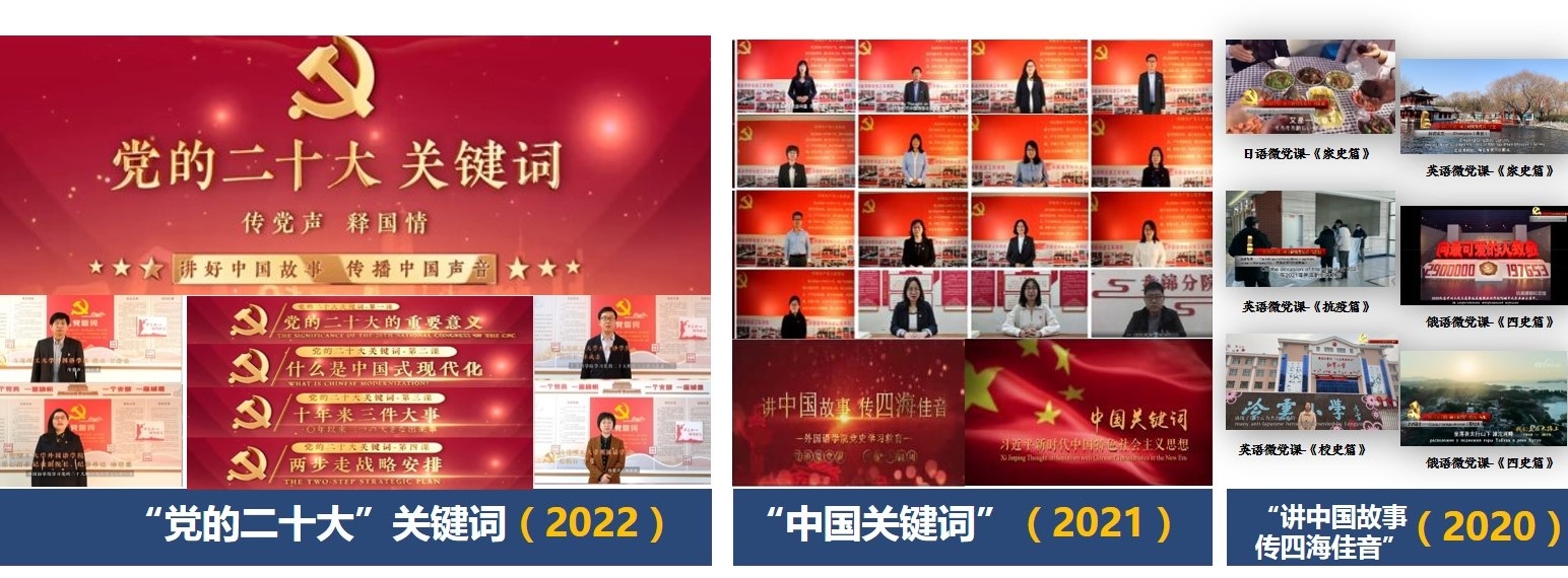 学院以双语微党课等特色精品为载体,于语言实践中增进家国情怀,相继组织开展“初心”(2019)、“讲中国故事,传四海佳音”(2020)、“中国关键词”(2021)“党的二十大关键词”(2022)、“学习进行时”(2023)等系列双语特色微课,累计100余节,被腾讯、B站等多家网站转发,经验工作案例获“辽宁省基层党委书记工作案例”一等奖!