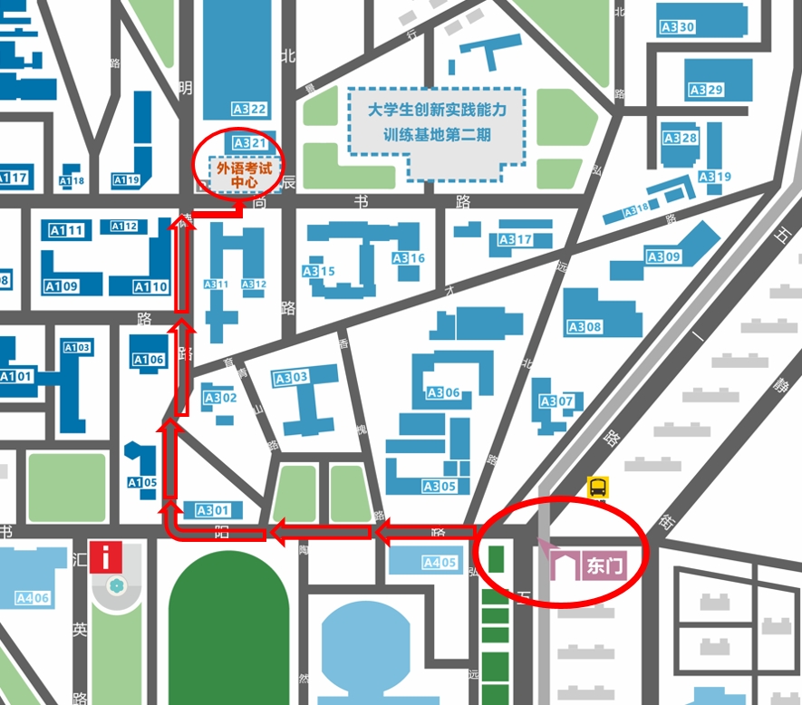 考生须由大连理工大学东门进入,在静美蜿蜒的林荫主干道步行10分钟即可到达位于尚书路与明德路交叉路口(1949咖啡厅斜对面)的考试中心。广大考生可参考下方交通指南。
