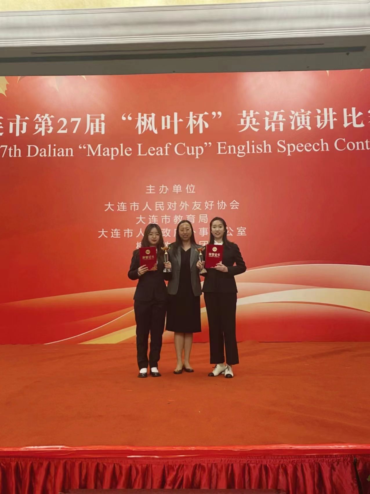 近日,由大连市人民对外友好协会、大连市教育局、大连市人民政府外事办公室及枫叶教育集团主办的大连市第二十七届“枫叶杯”英语演讲比赛成功举办。我院英语专业李济涛、欧阳文静荣获大学组一等奖,白晨获大学组三等奖。