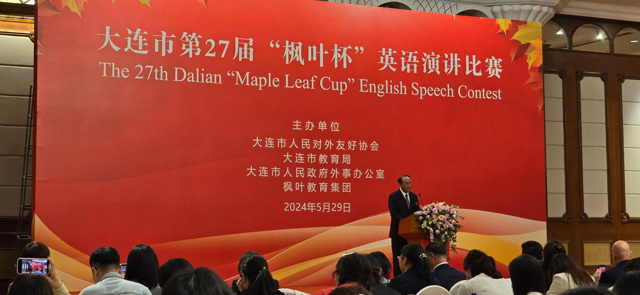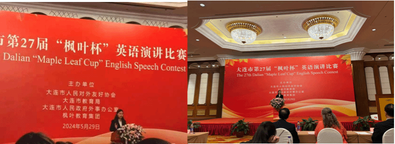 大连市第二十七届枫叶杯英语演讲比赛决赛于2024年5月29日举行,比赛共分为两个环节。选手现场抽题,经30分钟准备后脱稿即席演讲,时间为3-4分钟,演讲结束后回答来自外方评委提问,回答不超过一分钟。大连市对外友好协会肖盛峰、辽宁省高校外语教学研究会会长杨俊峰、枫叶教育集团校监和市政府外办、市对外友协、市教育局相关部门负责人及全市各校师生代表约600人出席现场。