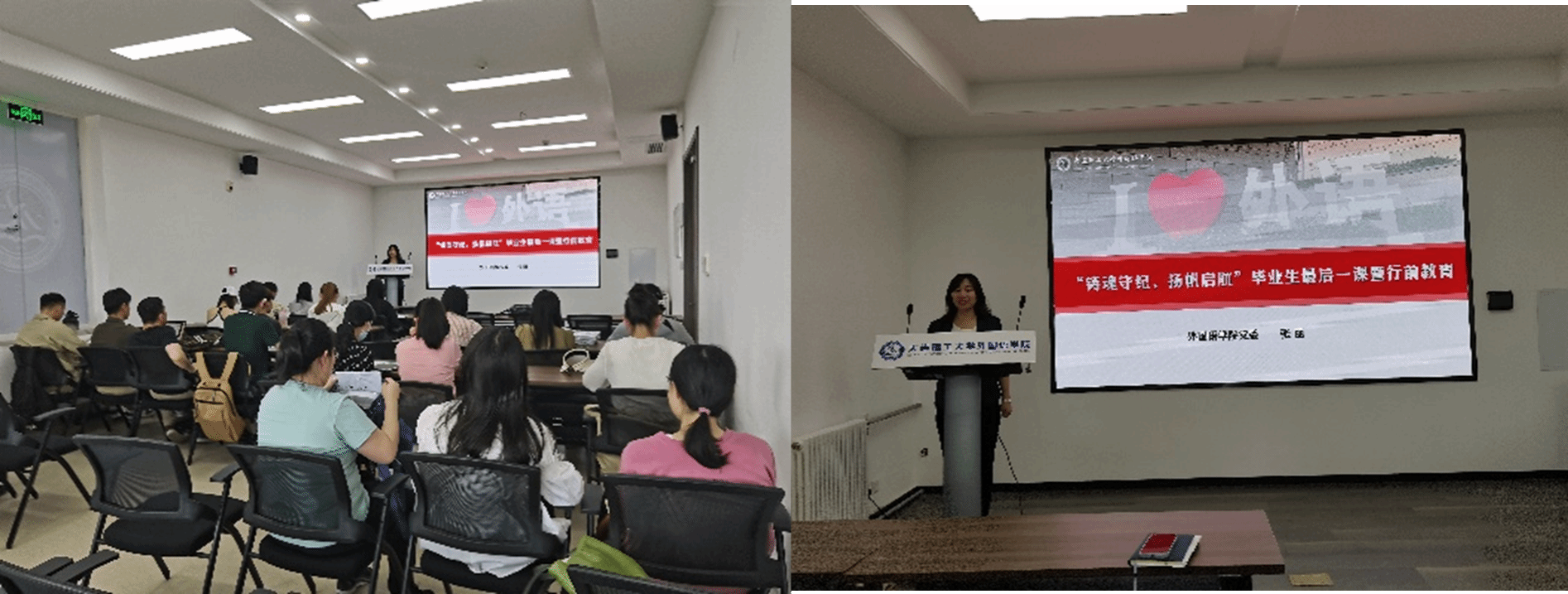 外国语学院党委书记张丽以“铸魂守纪、扬帆启航,博学笃志、贯通中外”为毕业生开展最后一课,围绕坚持初心使命,牢记党员身份发挥先锋模范作用,树立廉洁意识坚守纪律底线,发挥专业优势投身东北振兴、强国建设等四方面发出了对同学们的谆谆嘱托,希望有理想、有本领、有担当的新一代青年在未来广阔的人生舞台上,始终坚守党的信仰,勇往直前,不畏艰难,成为党和人民信赖的坚强力量。