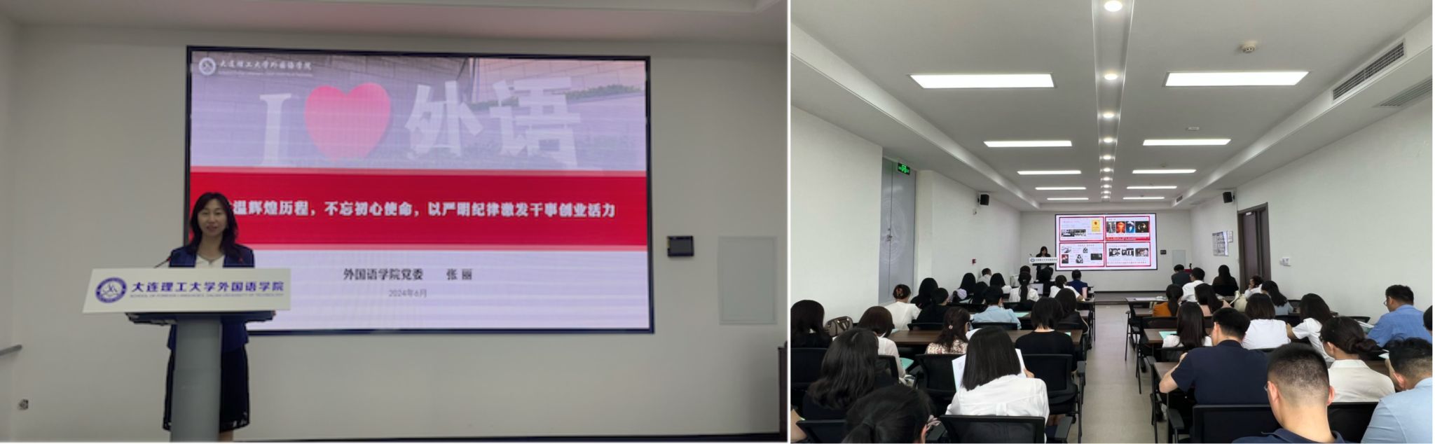 为了庆祝中国共产党成立103周年,外国语学院党委于6月20日在海晏楼举办迎“七一”主题党日。主题党日包括五部分内容:迎“七一”专题党课、“两优一先”表彰、“育人先锋”表彰及课程思政汇报交流以及新发展党员宣誓仪式。学院班子成员、全体教师党员以及学生代表参加,大会由党委组织员潘迪主持。