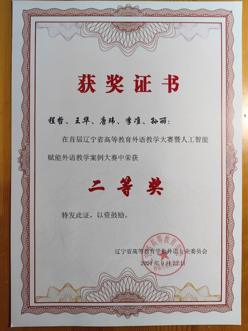 近日,辽宁省高等教育学会外语专业委员会成立大会暨首届辽宁省人工智能赋能外语教学案例大赛颁奖仪式及研讨会在东北大学举行。大会举行了首届辽宁省人工智能赋能外语教学案例大赛颁奖仪式,大连理工大学外国语学院程哲老师团队(团队成员:王华、唐玮、李准、孙丽)获得辽宁省二等奖,并在研讨会上分享了参赛课例,和与会评委教师围绕人工智能赋能外语教学展开研讨交流。