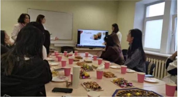 Лиза:最令我难忘的环节当属一些对中国文化感兴趣或者正在学习中文的俄罗斯学生与俄方老师为我们精心准备了冷餐会,一边介绍俄罗斯文化,比如一些童话形象、特色小吃、特色民族绘画等等,一边准备了各种亲身参与的小活动,比如跳舞、绘画等,这一场下来收获颇丰,知道了许多大学课堂里不曾讲过的知识,也结识了一些俄罗斯好朋友。