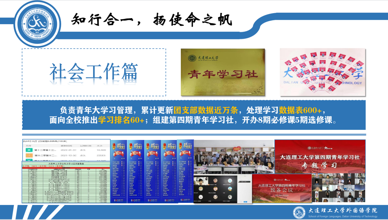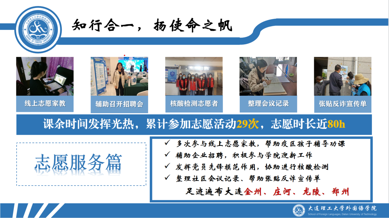 习近平总书记曾说,让青春在党和人民最需要的地方绽放绚丽之花。大工的外语人同新时代紧密相连,于海萍依托学校优质平台,积极投身各类社会实践与志愿服务。三年来她累计参加寒暑假社会实践4次,社区挂职1次,从企业走向社区,从家国走向民生,用脚步丈量祖国大地,用心灵感受人间温热。她累计参加志愿活动29次,志愿时长近80小时。涉及的志愿活动包括向抗疫人员子女免费家教服务、为河南受灾家庭孩子指导功课、同云南龙陵孩子介绍祖国大好河山等。大三学年,在疫情常态化校园封闭管控期间,她更是积极响应学院党员的应召,多次参与日常核酸检测志愿服务,用自己的实际行动创造温暖,也把自己的点滴光热奉献给学校。