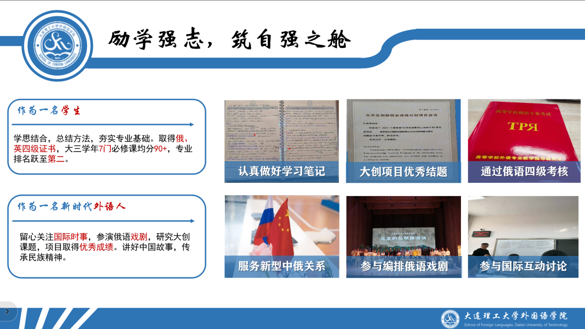 作为语言上没有天赋的普通学生,面对最难学的俄语,和专业50%的成绩,她重新审视专业课,计划从基础补齐短板。大二学年开始,她每日平均净学习时长10h。为提升综合能力,也带头研究中俄文化外交课题、参与俄语戏剧排演,书法演讲双线推进。终于,在大三学年,加权平均分提高6分,从50%一跃成为专业第二,实现了学习成绩上的突破。