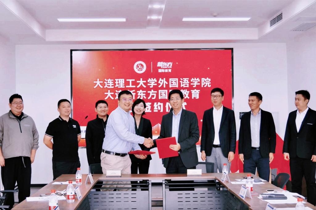 随后,大连理工大学外国语学院院长陈宏俊与新东方教育科技集团助理副总裁刘烁炀共同签署了校企合作协议。双方均表示,此次合作是开启外语教育新篇章的重要步骤,将共同努力培养更多具有国际视野、专业外语技能和跨文化交流能力的人才。揭牌仪式随即进行,标志着校企合作基地正式成立。