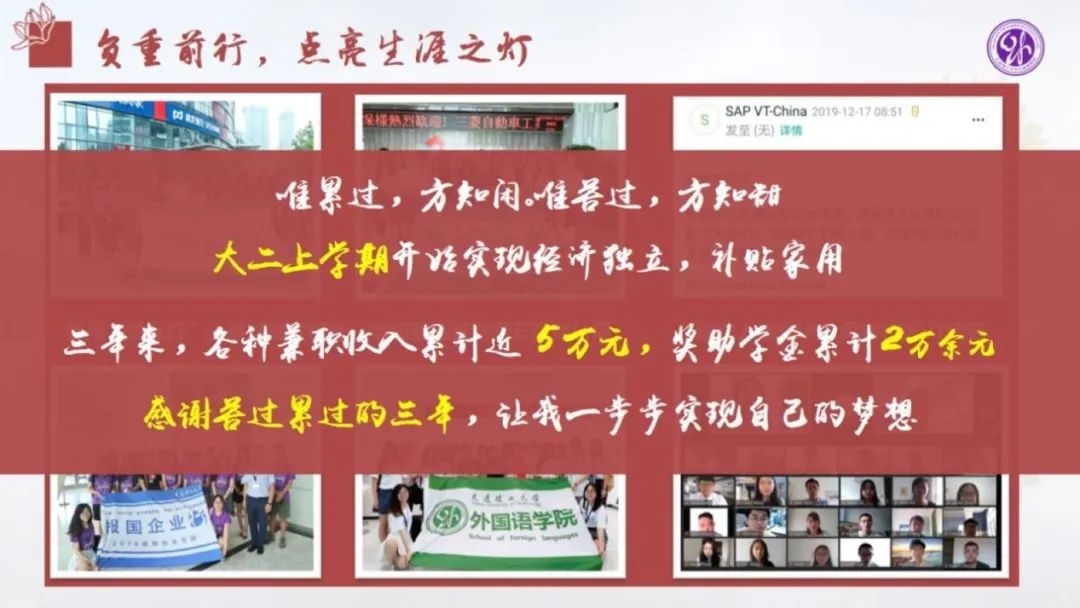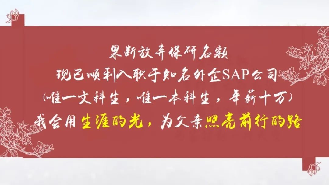 李博洋早已规划好自己的职业生涯,决定本科毕业后直接就业。如今的她,果断放弃保研名额,顺利入职知名外企SAP,是VT项目中唯一的文科生和本科生。自此,她得以用生涯的光,为父亲照亮前行的路。为了达成今天的梦想,李博洋一路奋力前行。