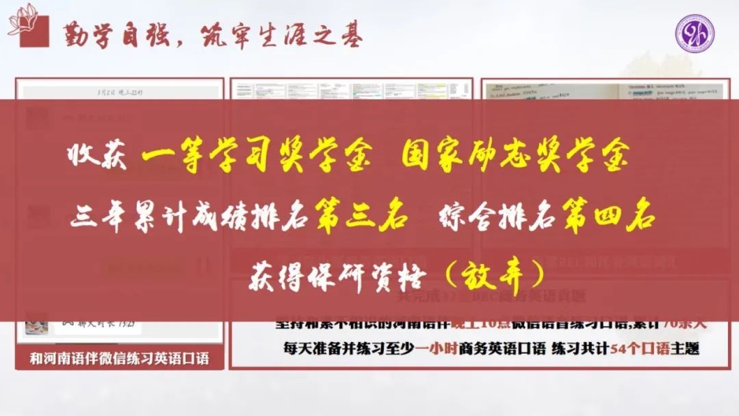 三年来,获一等学习奖学金、国家励志奖学金。以三年累计成绩第三名,综合成绩第四名荣获保研资格,扎根外语,筑牢生涯之基。