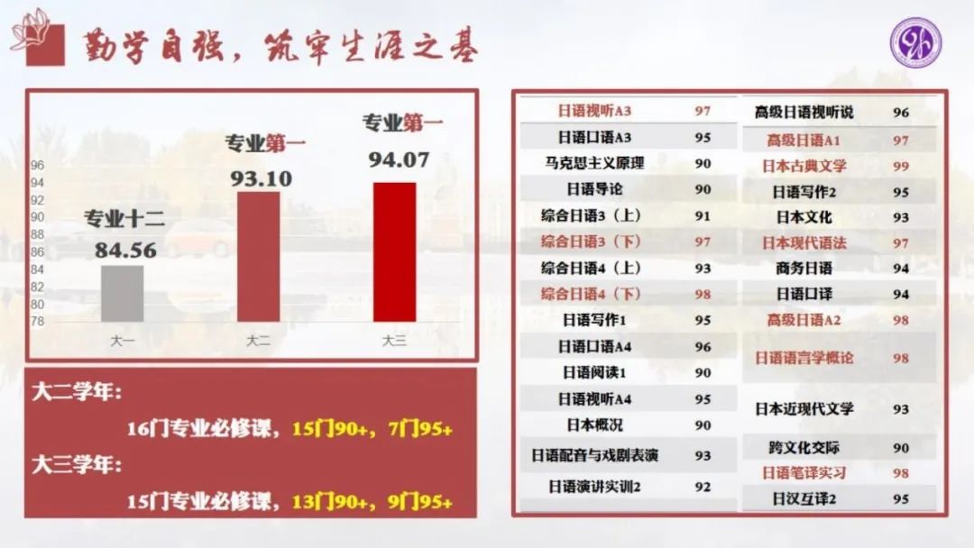 三年来,李博洋反复练习听说读写,早出晚归,从最初成绩的不理想,到现在成为日语专业的佼佼者:加权平均分从84.56分到94.07分,从专业十二到大二大三两年连续位列专业第一。