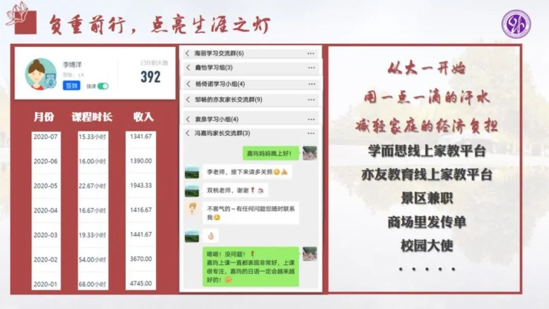 大一时,她做家教、发传单,希望用一滴滴的汗水,减轻家庭经济压力。