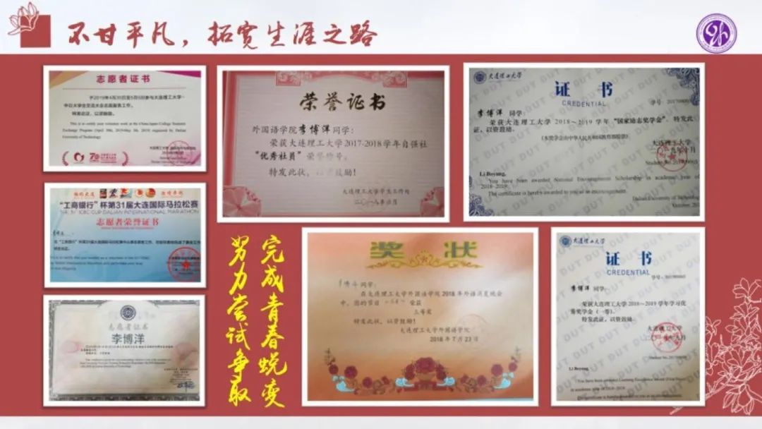 “虽然我不能像雄鹰一样一飞冲天,但我至少能够像蜗牛那样凭着耐力默默前行,我会为我的理想一直去奋斗。”她愿做逆境中的向日葵,厚积薄发,在2019-2020学年校自立自强标兵仅评选10人的情况下,李博洋荣获大连理工大学2019-2020学年“自立自强标兵”称号。