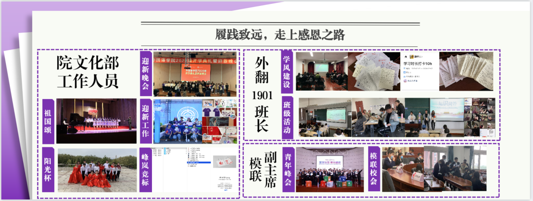 学生工作,是她绽放自己的又一个平台。“曰勤曰慎,履践致远”,这就是她在2020—2021学年度的学生工作中的勉励箴言。这一学年、她主要担任外翻1901班班长、外国语学院文化部工作人员以及模拟联合国协会副主席。专业分流之后,在班级同学的支持下,她开启班长这项工作的门扉。同时,在空降学院文化部大二工作人员的职位后,她迅速熟悉部门职责,第一时间投入到工作当中去。作为模拟联合国协会副主席、大连理工大学模拟联合国大会副秘书长,她在社团建设方面也付出了心血与激情。沙龙培训上激烈的辩论与观点交锋、筹备校会的艰辛与繁琐、校会举办期间每位代表的意气风发、青年峰会圆满结束时的满足…事不求易者成,事不避难者进,这一切磨练了她的意志和能力。