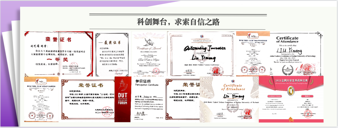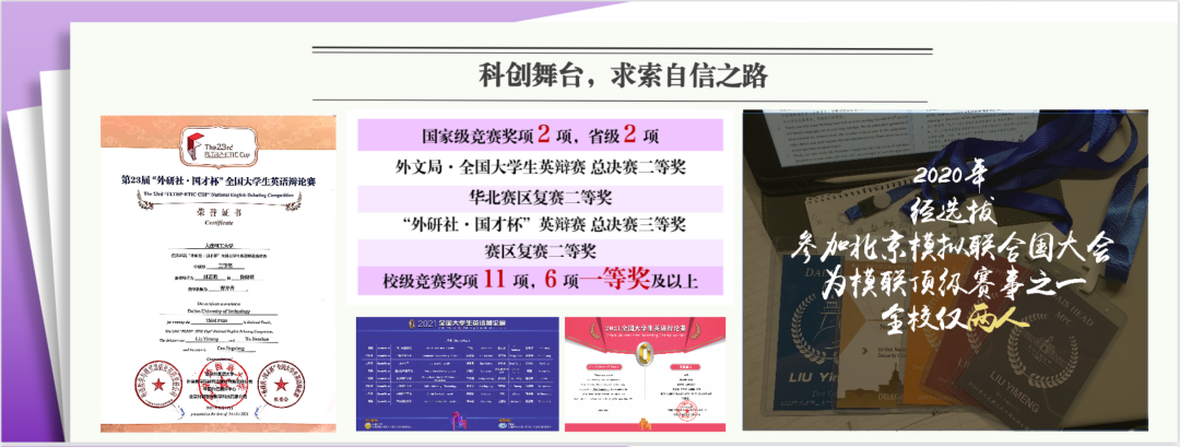 除了学习成绩之外,学科竞赛是她另外一棵收获之树。她第一次参加大学中的英语演讲比赛,便取得了校级一等奖的优异成绩。她在外语方面的优秀天赋得到了专业教师的赏识,加入了英辩社,并在随后的校选赛当中凭借自己的不凡谈吐与风采取得了第一名。她首次参与“外研社杯”英辩赛,一路过关斩将,成功晋级总决赛,最终取得了全国三等奖的成绩。在紧随而来的外文局全国大学生英辩赛中,更上一层,取得了全国二等奖的成绩。她的文体生活里,不仅交织着英辩与演讲,也活跃着模拟联合国赛事。