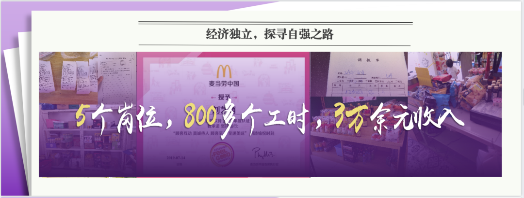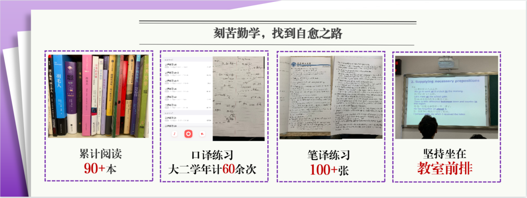 她下定决心做出改变,在专业课上一步一个脚印,将自己的成绩提升了50%的排名,在分流后展现出了自己优秀的专业素养与外语能力。尽管这期间家庭出现了巨大的变故,在师长同学的帮助下,她维持了良好的心态投身学业。最终学年加权平均分90.49,位列专业第三名。