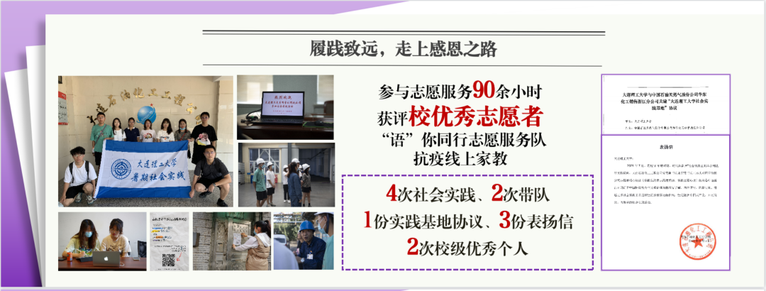 在志愿服务和社会实践中,她感受到了自己对于别人的价值。进入大学之后,她积极参与志愿服务工作。疫情爆发之时虽没有能力冲上抗疫第一线,但她坚持在后方为医护人员子女提供优质的家教服务,寒来暑往,至今仍在继续。在2020年,她荣获了大连理工大学优秀志愿者的称号,是外国语学院本年度唯一一位校优秀志愿者。她利用了每个寒暑假参与社会实践活动,两次荣获校优秀个人三等奖,社会实践队分别获得校二等奖和校三等奖。缜密的筹划,严谨的执行,实践中的付出,让她收获了一段段难忘的经历。