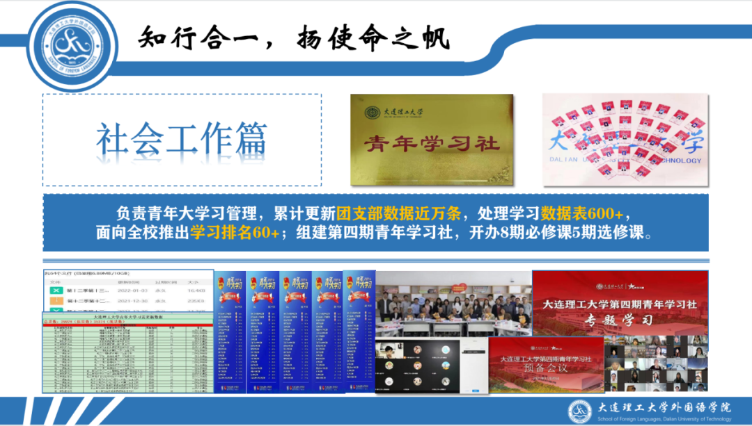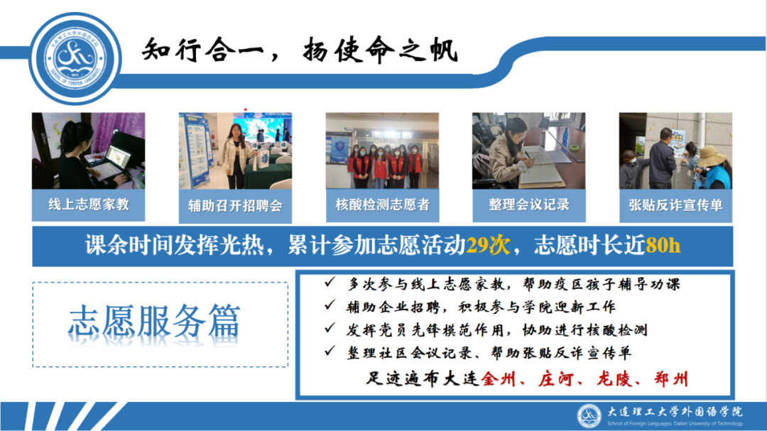 习近平总书记曾说,“让青春在党和人民最需要的地方绽放绚丽之花。”大工的外语人同新时代紧密相连,于海萍依托学校优质平台,积极投身各类社会实践与志愿服务。三年来她累计参加寒暑假社会实践4次,社区挂职1次,从企业走向社区,从家国走向民生,用脚步丈量祖国大地,用心灵感受人间温热。她累计参加志愿活动29次,志愿时长近80小时。涉及的志愿活动包括向抗疫人员子女免费家教服务、为河南受灾家庭孩子指导功课、同云南龙陵孩子介绍祖国大好河山等。大三学年,在疫情常态化校园封闭管控期间,她更是积极响应学院党员的应召,多次参与日常核酸检测志愿服务,用自己的实际行动创造温暖,也把自己的点滴光热奉献给学校。